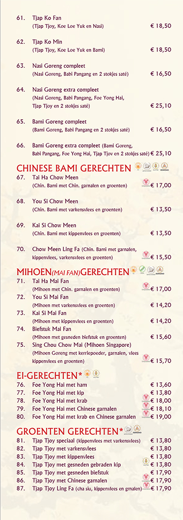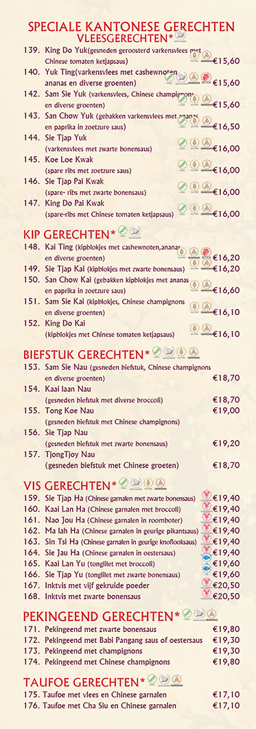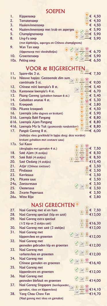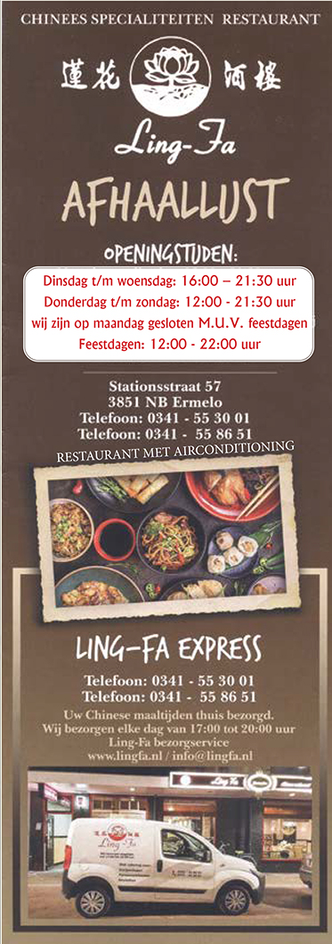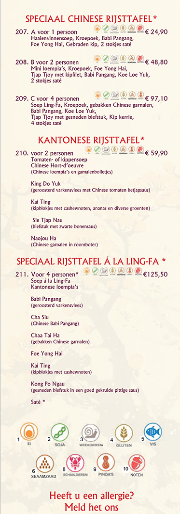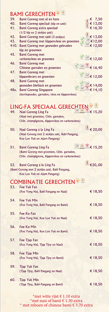 Natuurlijk kunt u bij Ling Fa ook terecht voor afhaalmenu’s. Sterker nog, daar hebben we een speciale uitgebreide kaart voor. Voor uw gemak hebben we hieronder onze volledige afhaalmenu staan.